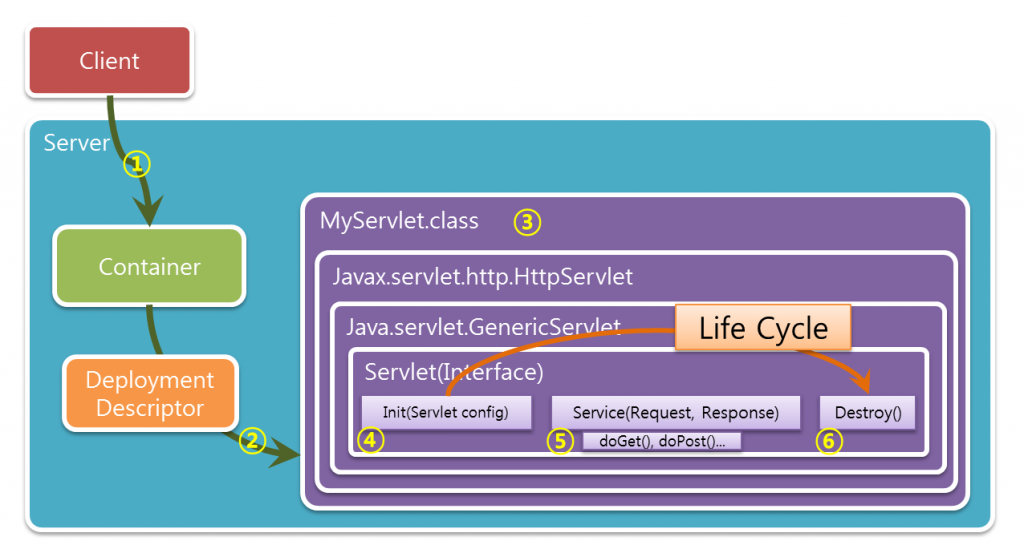 ์๋ธ๋ฆฟ์ ์๋ช ์ฃผ๊ธฐ [์ถ์ฒ : https://myblog.opendocs.co.kr/archives/438] โ ์ฌ์ฉ์๋ก๋ถํฐ ํน์ ํ์ด์ง์ ๋ํ ์์ฒญ์ด ๋ค์ด์ค๋ฉด ์ปจํ ์ด๋๋ก ์์ฒญ ์ ๋ณด๊ฐ ์ ํด์ง๋ค