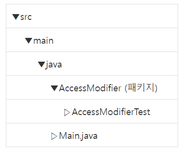 λ¨Όμ , java ν΄λ μμ AcceccModifierλΌλ ν¨ν€μ§λ₯Ό λ§λ€μ΄μ, AcceccModifierTest.java ν΄λμ€νμΌμ λ§λ€μ΄ μ€λλ€. μ¬κΈ° ν΄λμ€ νμΌμλ ν μ€νΈλ₯Ό μν΄ private, public, protectedλ‘ κ°κ° μ μΈνμ¬ λ©μλλ₯Ό λ§λ€μ΄μ£Όκ² μ΅λλ€.